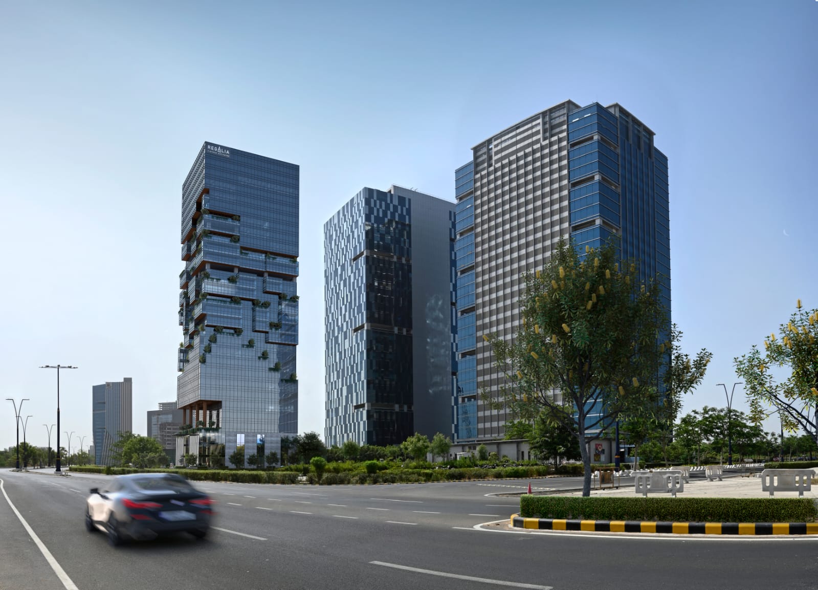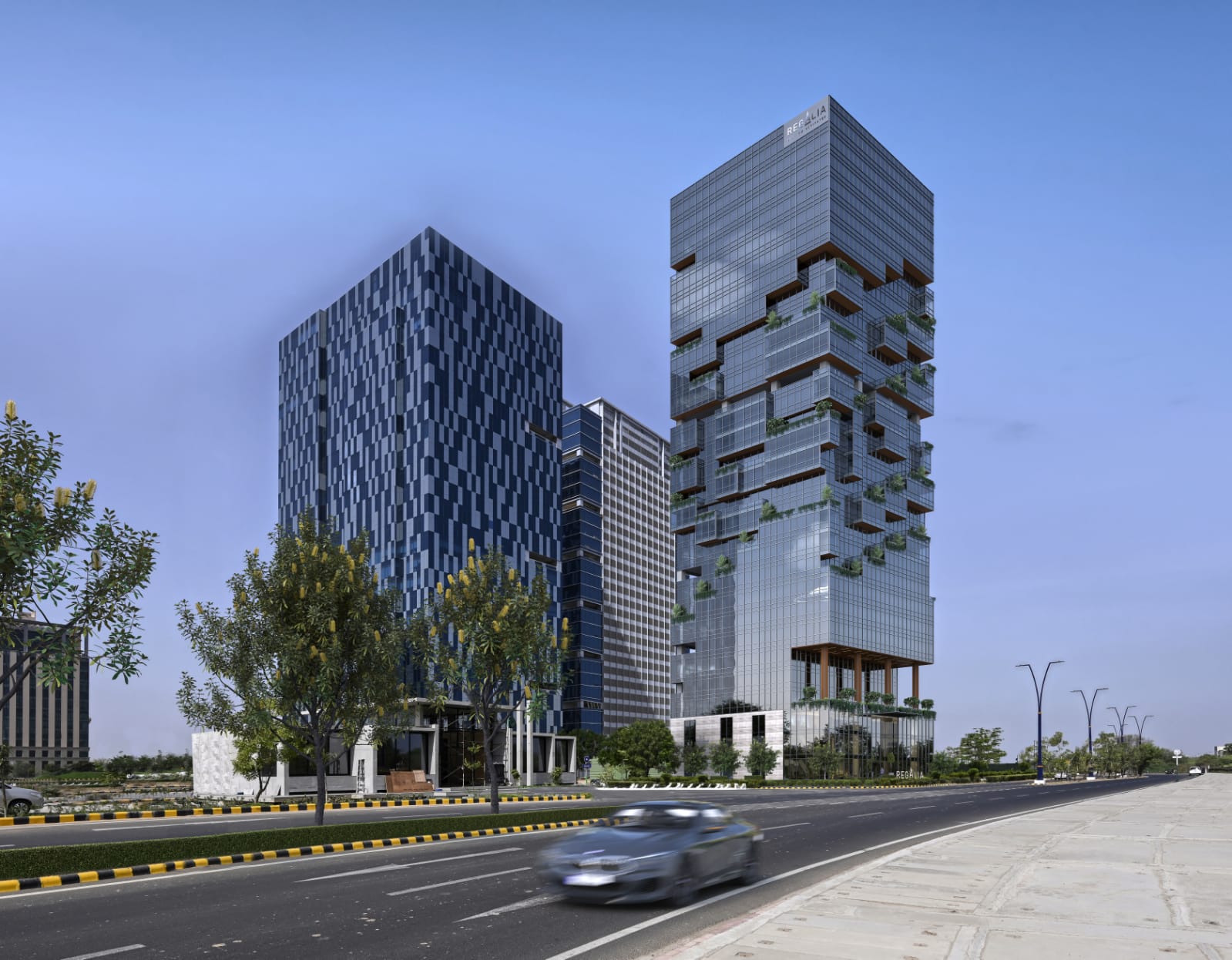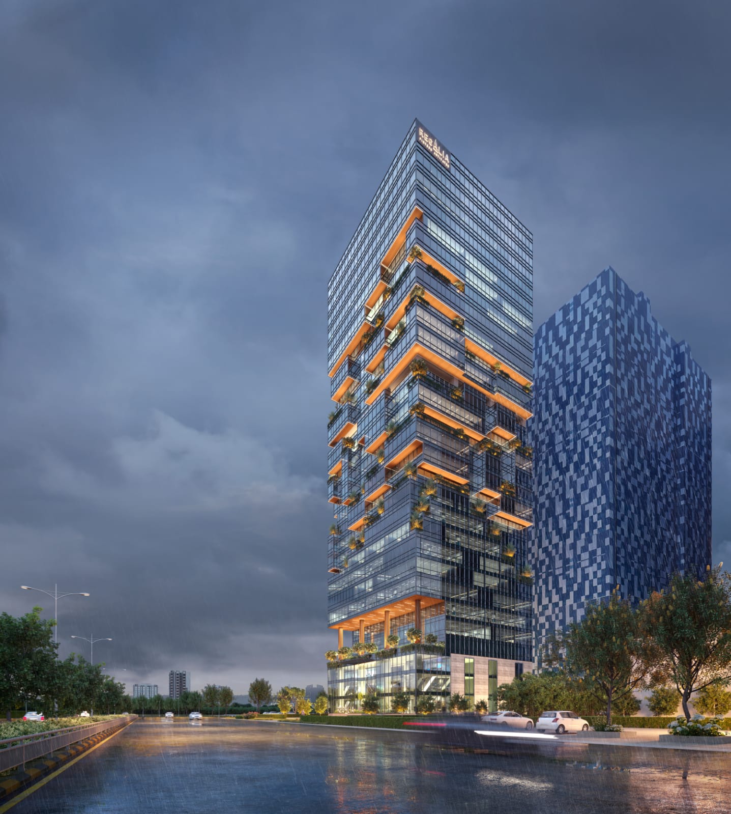 Regalia’s architectural identity reflects a contemporary design language that focuses on commercial efficiency and corporate presence. The building’s façade and structural form are engineered to provide an elegant, premium look that complements GIFT City’s global business environment. The commercial tower integrates high-speed elevators, triple-height entrance lobbies, and ample parking spaces to support both occupant and visitor convenience.
